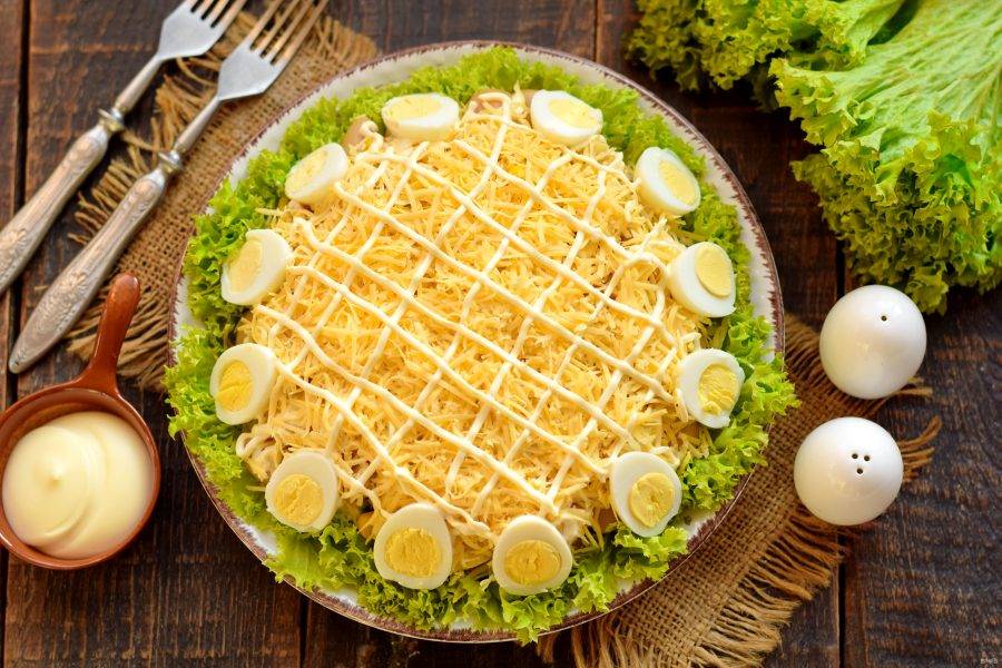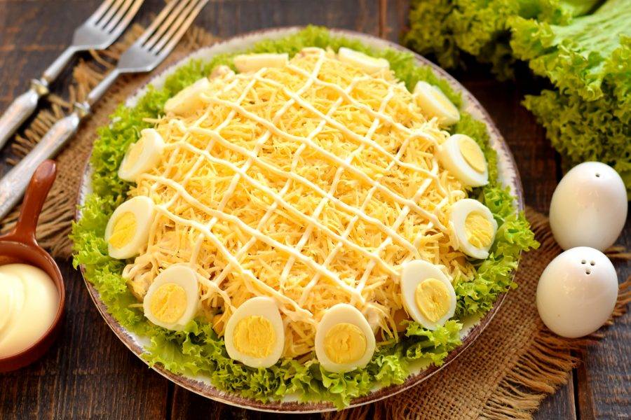 Твердый сыр натрите на мелкой терке, присыпьте верхушку салата. Сверху сделайте сетку из майонеза. Салат поставьте в холодильник на 30 минут, чтобы слои пропитались.