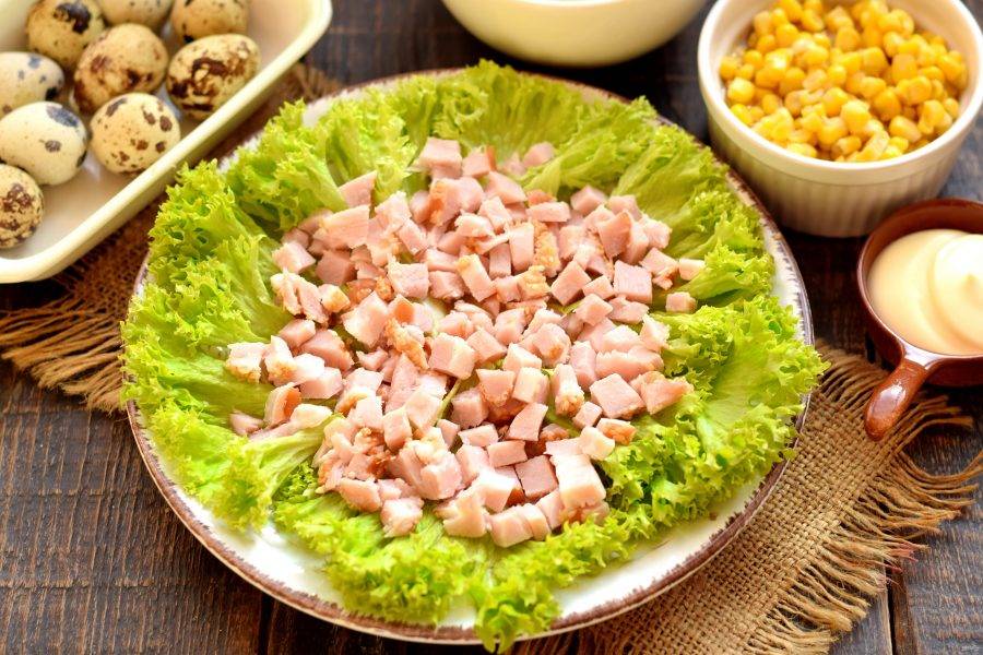 Листья салата ополосните, высушите, выложите по кругу на плоской тарелке для подачи. Ветчину нарежьте мелким кубиком, выложите на листья салата.