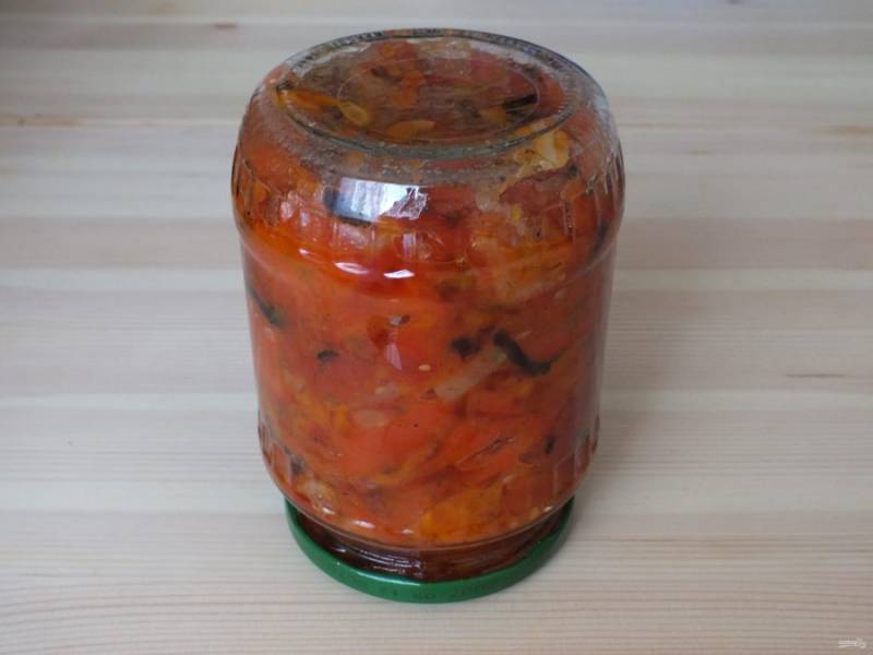 Готовый салат разложите по стерилизованным банкам, герметично закройте чистыми, сухими крышками. Переверните, укутайте и охладите в таком виде.