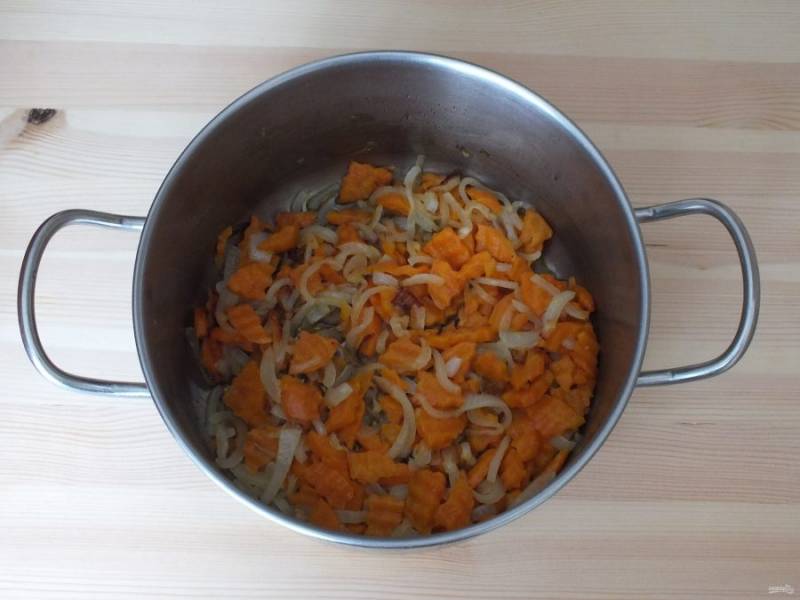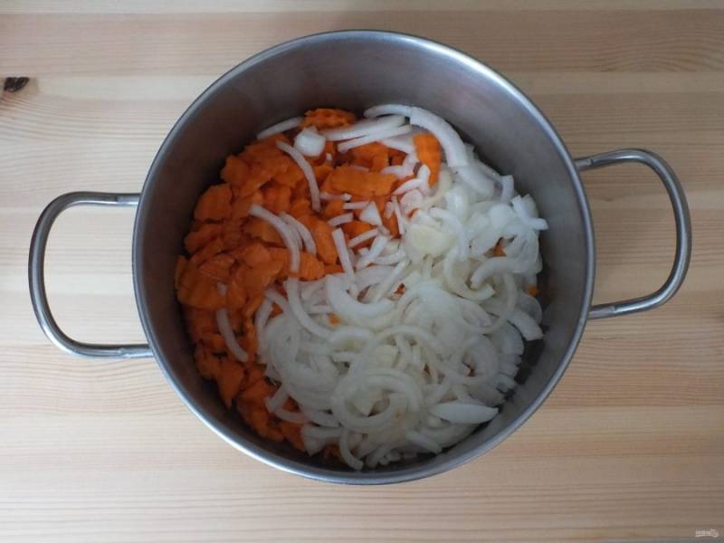 Очищенную морковь нарежьте шайбочками или половинками шайбочек, лук полукольцами. Переложите овощи в кастрюлю с толстым дном. Добавьте 50 мл. растительного масла.