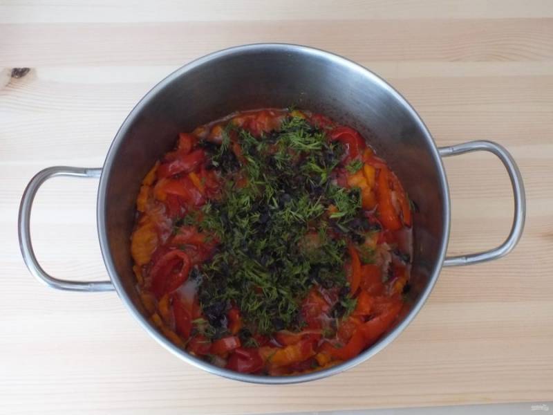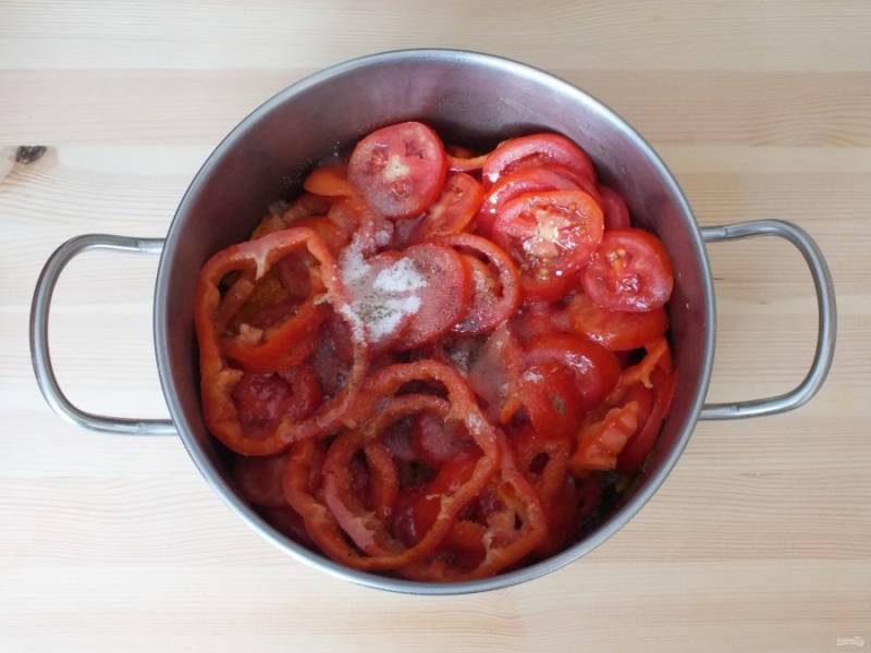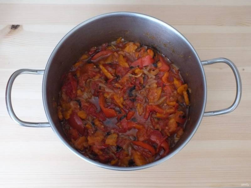 Переложите овощи к обжаренным моркови и луку. Добавьте 50 мл. растительного масла, соль, сахар, черный перец. Поставьте на огонь чуть ниже среднего и после закипания варите 25 минут, периодически помешивая.