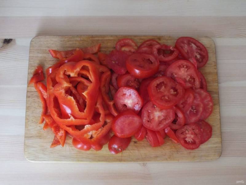 Перец и помидоры нарежьте кружочками.