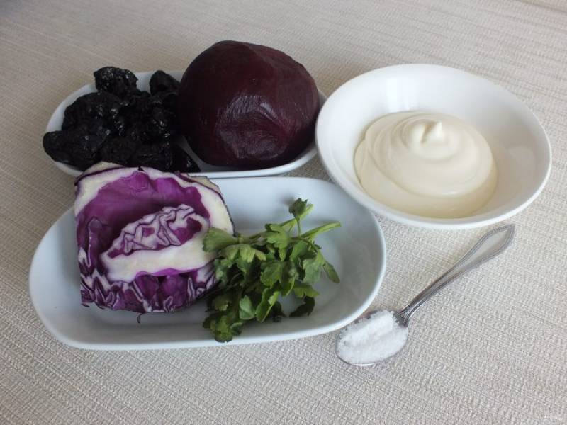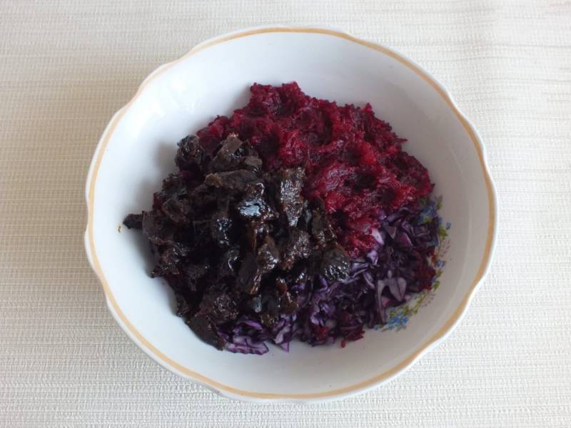 По истечении времени соедините в салатнике: тертую на мелкой терке свеклу, шинкованную капусту и нарезанный тонкой соломкой чернослив.