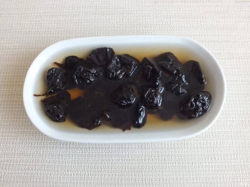 Чернослив промойте и залейте кипятком. Оставьте на 10-15 минут для размягчения.