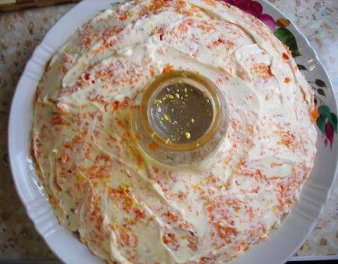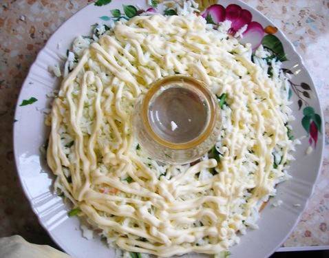 9. Морковь очистить и натереть на терке. Выложить в салат и смазать майонезом.