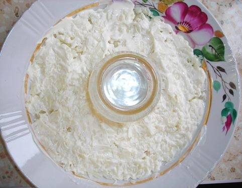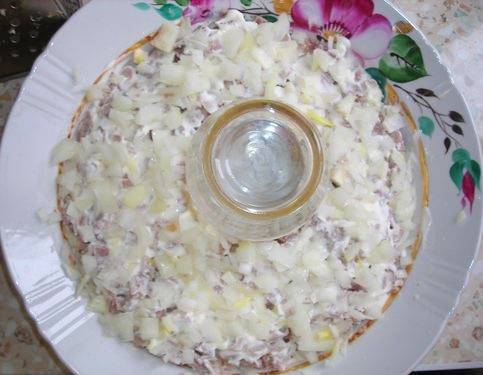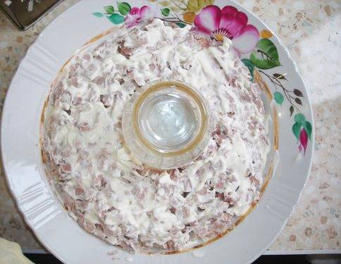 1. Рецепт приготовления салата "Браслет" начинается с подготовки всех ингредиентов. Необходимо вымыть и поставить варить мясо, морковь и картофель, свеклу и яйца. Готовый картофель остудить, очистить и натереть на средней терке. Чтобы удобнее было поддерживать форму салата, в середину блюда можно поставить высокий стакан. Выложить картофель на тарелку, можно посолить и поперчить, смазать обильно майонезом.
