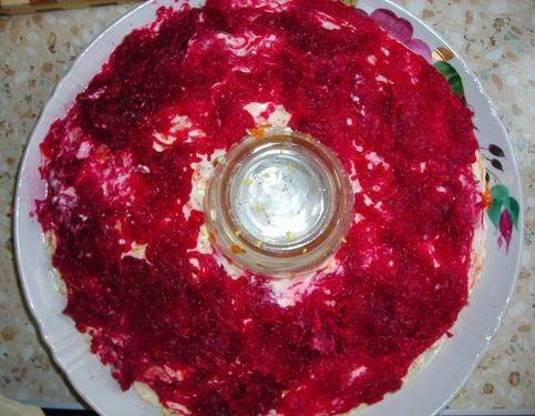 10. Свеклу очистить и также натереть на терке. Выложить следующим слоем и прижать руками или ложкой. Смазать майонезом.