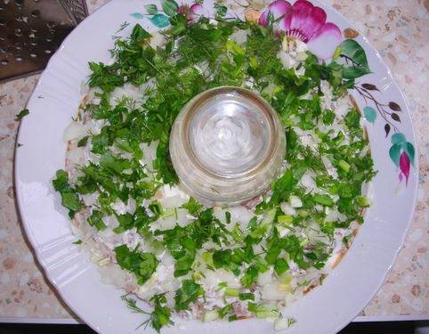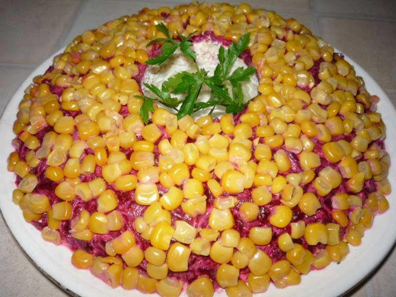 11. Консервированную кукурузу откинуть на дуршлаг. Выложить верхним слоем. Теперь стакан из середины можно аккуратно достать. Салат отправить в холодильник на некоторое время, чтобы он пропитался. Вот и все, салат "Браслет" в домашних условиях можно украсить зеленью и подавать к столу.