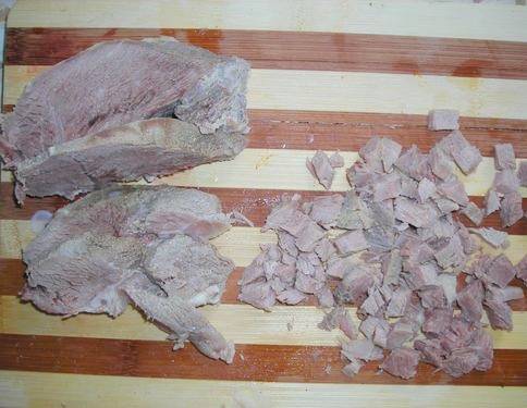 2. Отварное мясо остудить и нарезать небольшими кубиками.