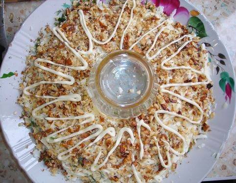 7. Грецкие орехи измельчить с помощью блендера или кухонного молоточка. Выложить в салат и немного промазать майонезом.