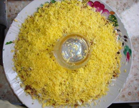 8. Желтки натереть на терке или размять вилкой. Немного подсолить и выложить следующим слоем.