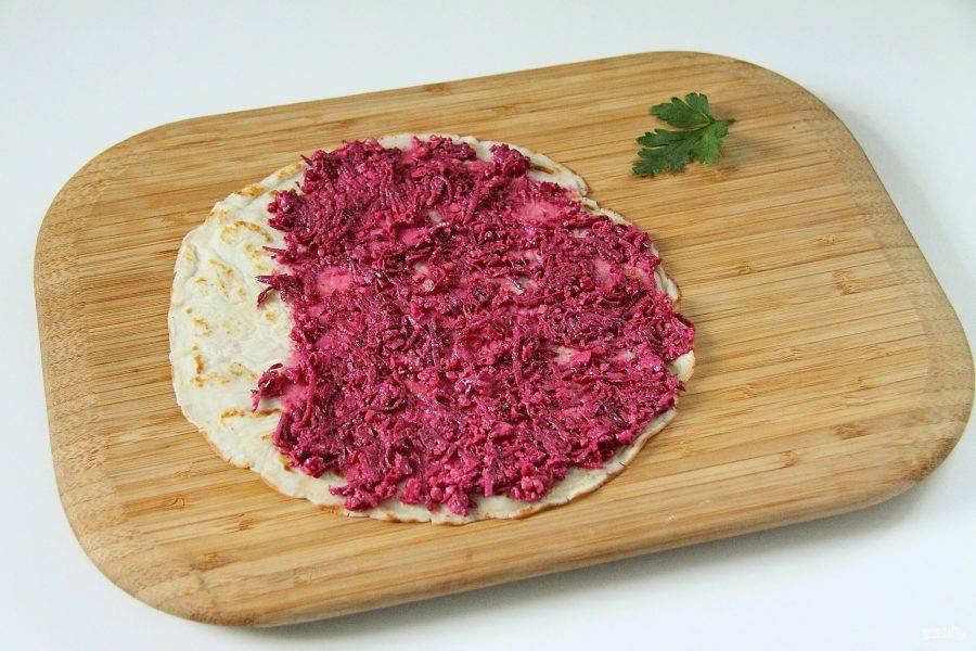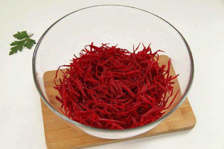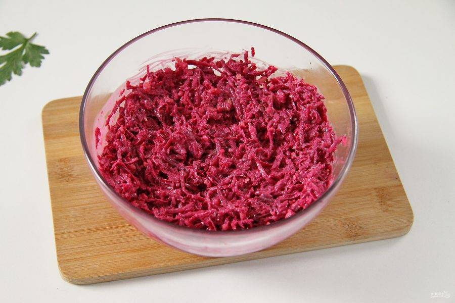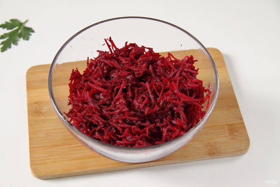 Для начинки натрите оставшуюся свеклу на мелкой терке (свекла везде сырая, предварительно ее не отвариваем).