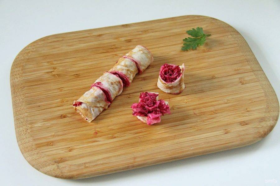 Заверните блин в рулет и нарежьте кусочками шириной около 2 см. На каждом кусочке сделайте с одной стороны 4 надреза кухонными ножницами и немного расправьте руками получившееся "лепестки".
