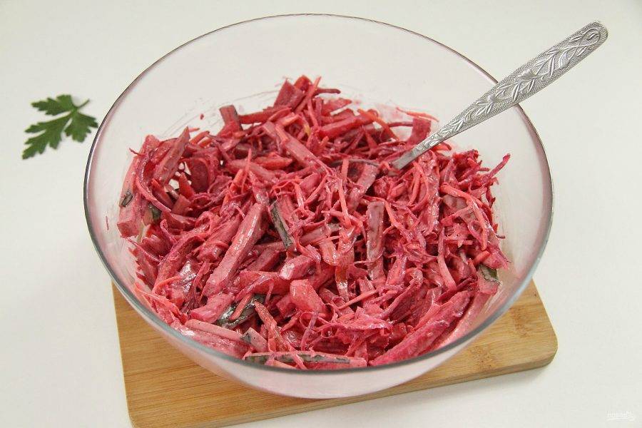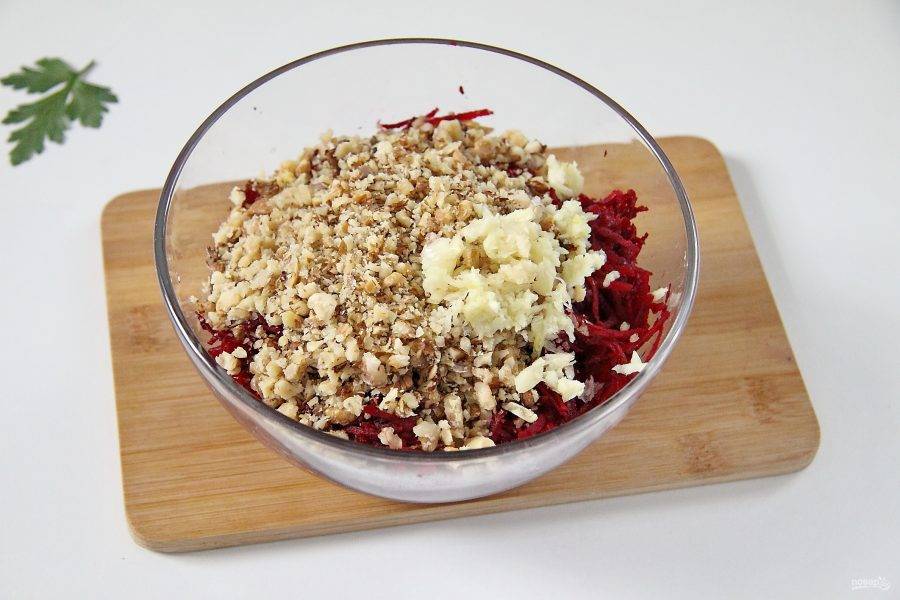Добавьте к свекле измельченные грецкие орехи и пропущенный через пресс чеснок.