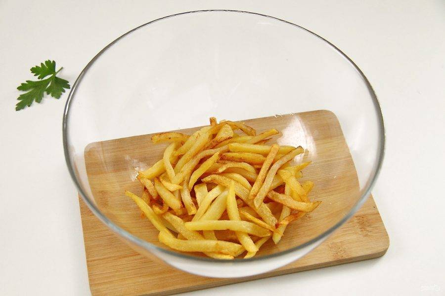 Обжарьте картофель на сковороде до готовности. Посолите и переложите на бумажное полотенце, чтобы убрать излишки жира. Затем картофель положите в глубокую миску или салатник.