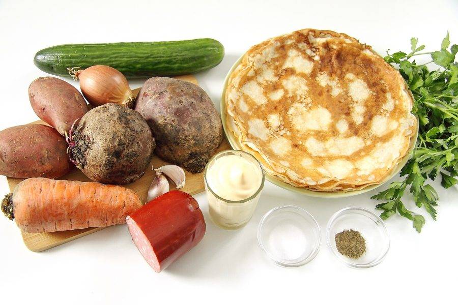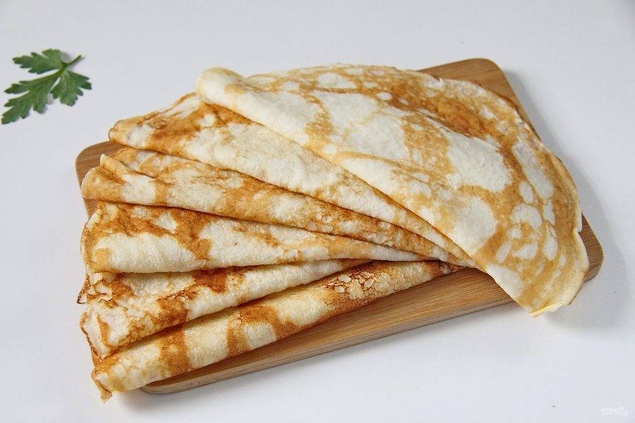 Приготовьте блины. Их можно испечь по любимому рецепту, главное условие - они не должны быть сладкими. Я делаю тесто так: соединяю яйцо с 1 ч.л. сахара и 0,5 ч.л. соли. Немного взбиваю и добавляю 1 стакан молока, 100 грамм муки, 1 ст.л. растительного масла и щепотку соды. Перемешиваю до исчезновения комочков. Тесто готово. Из указанного количества ингредиентов должно получиться 6 штук.