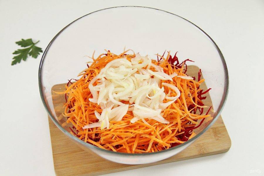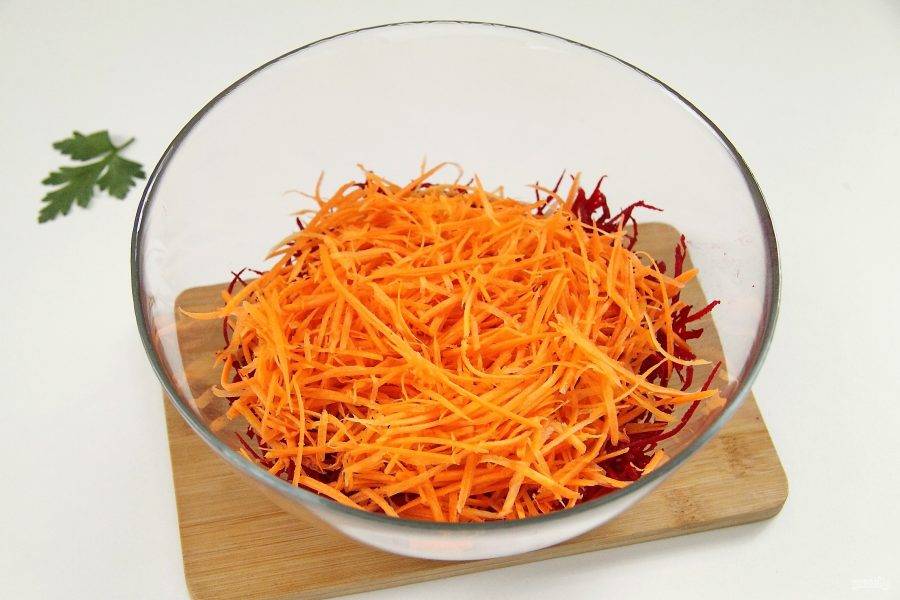 100 грамм свеклы натрите на корейской терке и добавьте к картофелю.