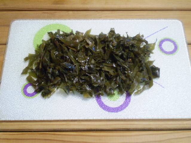 1. Приготовим продукты. Для таких салатов я покупаю уже готовую маринованную морскую капусту. Её промывать не нужно. Яйцо отварить.