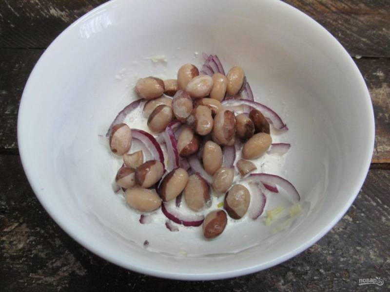 Фасоль берите заранее сваренную или уже готовую консервированную. С консервированной слейте жидкость. Если варите сами, тогда фасоль необходимо замочить в холодной воде, а через 8 часов слить воду и промыть фасоль, залить чистой водой и варить до готовности, не солить. Добавьте фасоль в салат.