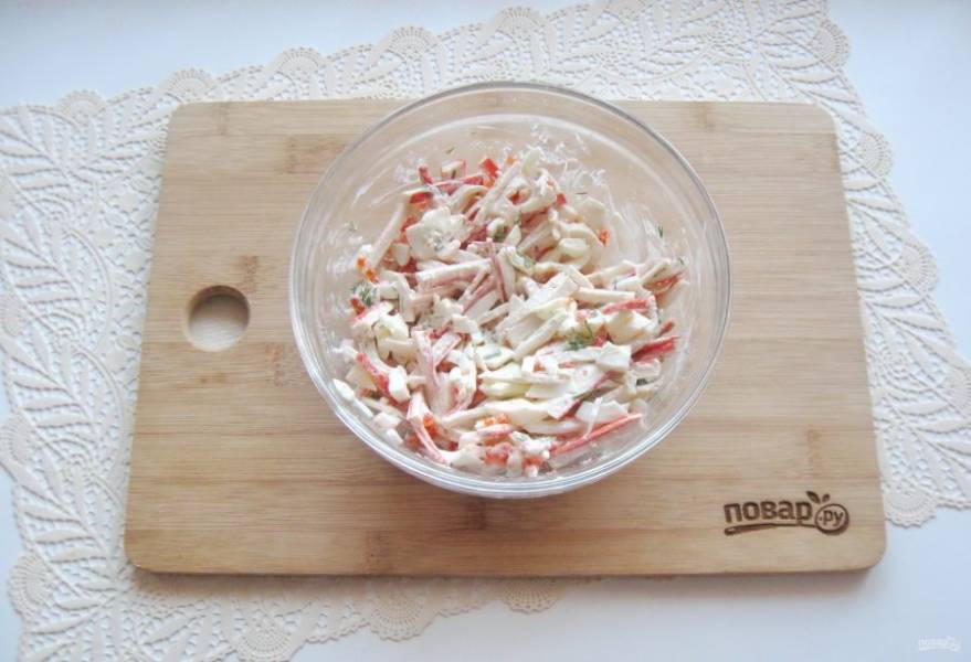 Салат посолите и поперчите по вкусу. Заправьте майонезом.