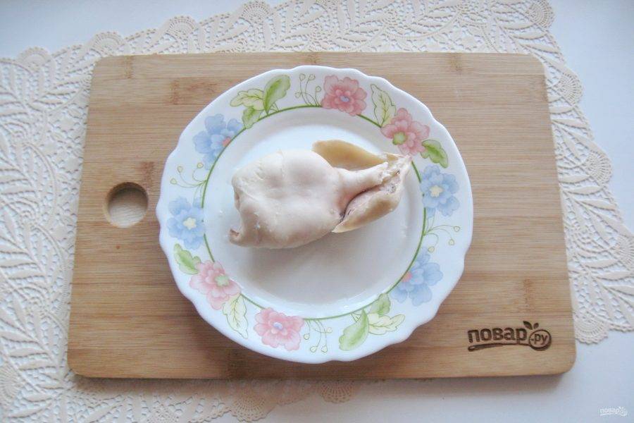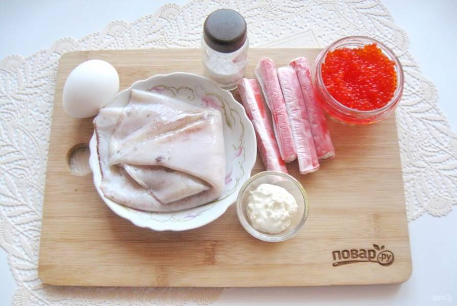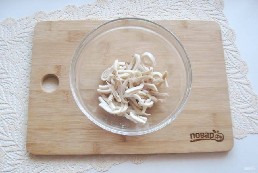 В кастрюле доведите воду до кипения и выложите очищенный кальмар. Варите 3 минуты и извлеките. После охладите.