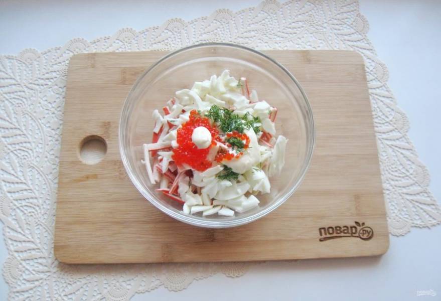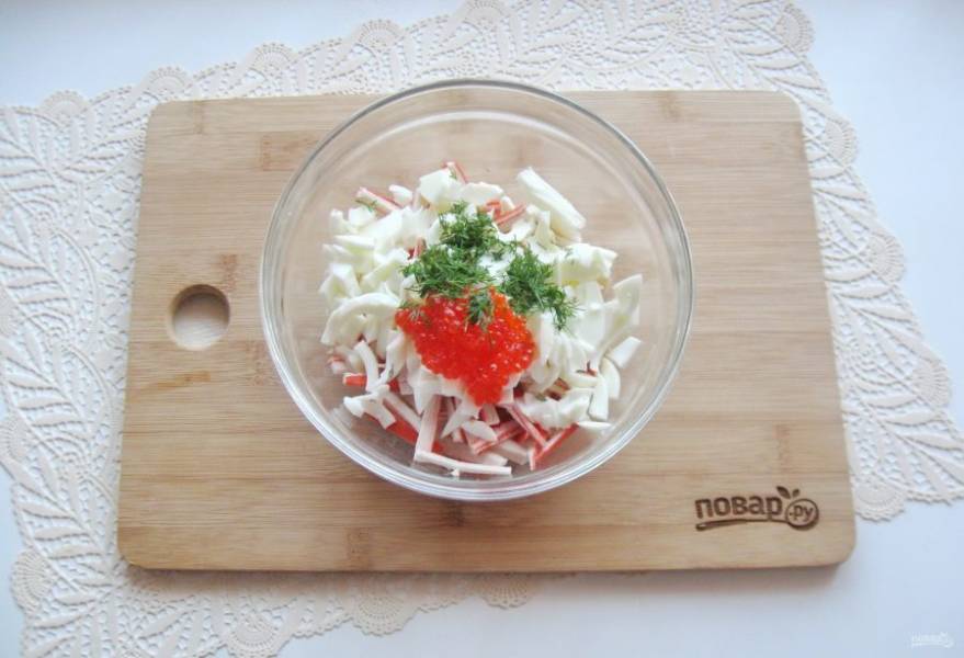 Для любителей морепродуктов предлагаю вкусный и простой салат. Благодаря наличию в нем красной икры, салат получил название "Царская радость". Попробуйте!