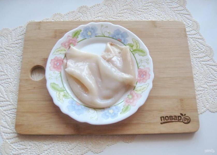 Кальмар очистите от пленки, удалите хорду и промойте холодной водой.