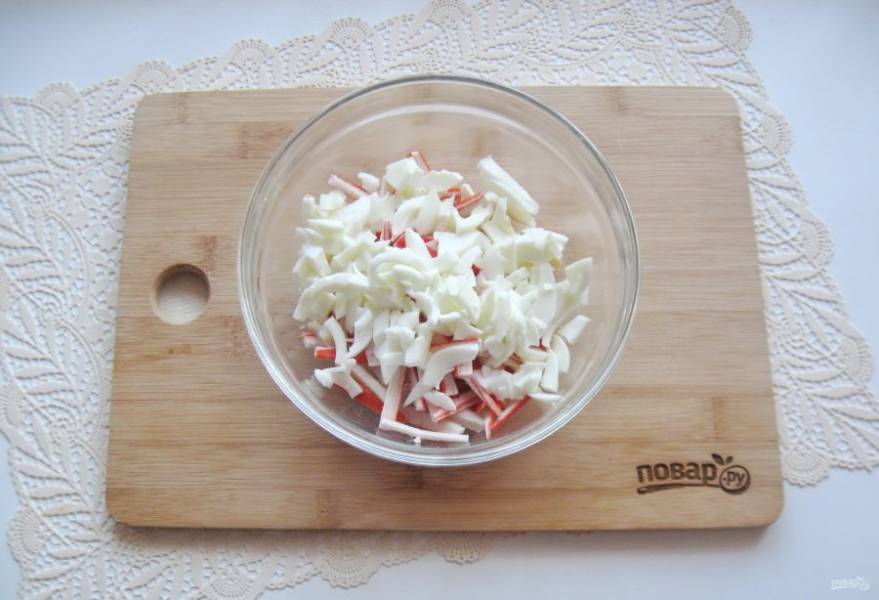 Яйца сварите вкрутую, охладите и очистите. Разделите на желток и белок. Желток в салате не понадобится. Белок нарежьте соломкой.