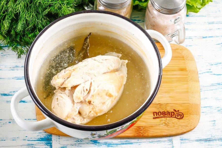 Куриное филе отварите в воде заранее, примерно за 30 минут до приготовления блюда и остудите.