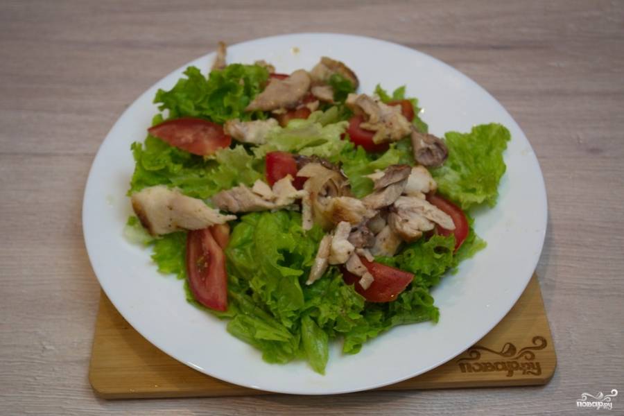 Свежие помидоры нарезаем на дольки и выкладываем кусочками на листья салата. Используем помидоры для яркости красок и придания салату яркого внешнего вида.