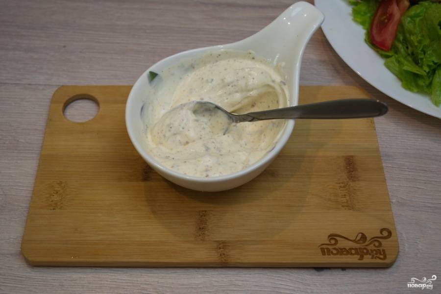 Для создания соуса к салату "Цезарь" смешайте в равных пропорциях майонез и сметану. Добавьте немного соли, молотого кориандра, эстрагона и орегано. Перемешайте.