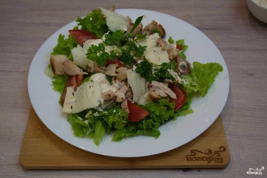Выложите соус на салат хаотично.... При помощи овощечистики нарежьте сыр слайсами. Кусочки сыра выложите на салат. Здесь, так же как и в случае с курицей, не принципиально, какой именно брать сыр. Главное, чтобы он был твердого сорта.