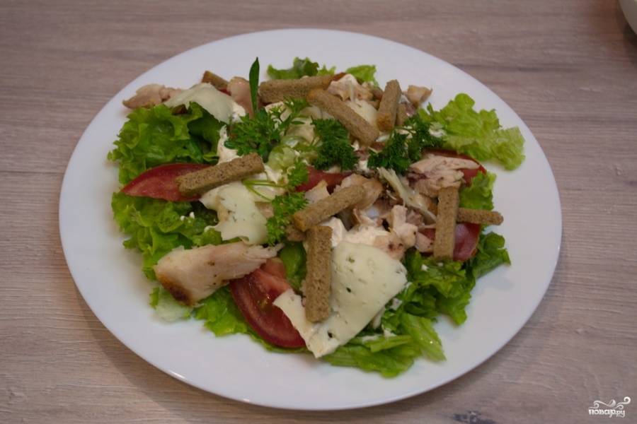 Сухарики выложите поверх всего. Для приготовления салата можно взять покупные сухарики или сухарики, приготовленные дома на сковороде или в духовке.