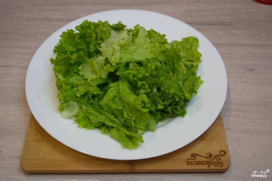 Для приготовления салата "Цезарь" классического простого нам необходимо взять салатные листья. Промойте их и нарвите небольшими кусочками.