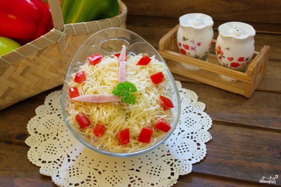 Заправьте салат майонезом. Перемешайте. Уложите салат в глубокую мисочку. Разровняйте. Натрите на мелкой терке немного твердого сыра. Выложите натертый сыр поверх салата, разровняйте. Из ветчины вырежьте стрелки часов. Цифры на часах можно обозначить схематически. Это могут быть оливки, кусочки моркови или помидора, кусочки огурчика.