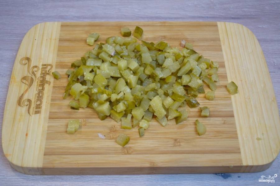 Соленые огурцы нужно извлечь из рассола и нарезать небольшими кубиками. Шкурку можно не снимать. Это не принципиально.
