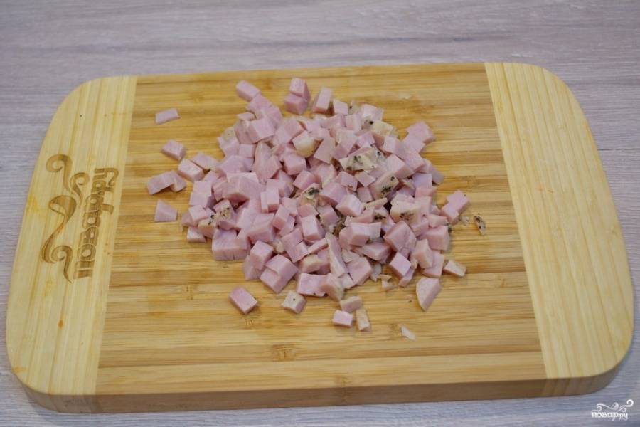 Для приготовления салата нужно взять один из видов мясных готовых изделий. Подойдет буженина, ветчина или сочная говядина. Для приготовления салата можно взять микс мясных изделий, но не колбасу. Я беру буженину. Нарезаем ее небольшими кусочками.
