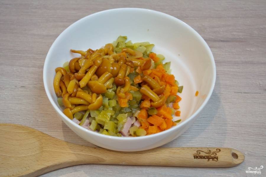 Отварите морковь в мундире. Очистите и нарежьте её небольшими кубиками. Добавьте в салат. Для салата я использую консервированные опята, но можно взять и другой сорт маринованных грибов. Слишком крупные грибы лучше порезать.