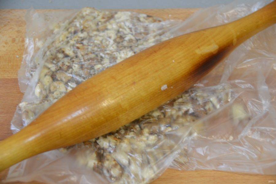 Положите грецкие орехи в пакет и измельчите их скалкой, но не слишком мелко, чтобы чувствовалась структура ореха.