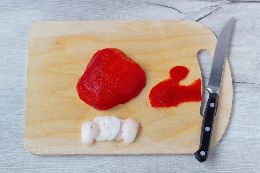 Редис очистите и нарежьте кольцами. С перца острым ножом снимите грубую кожицу.
