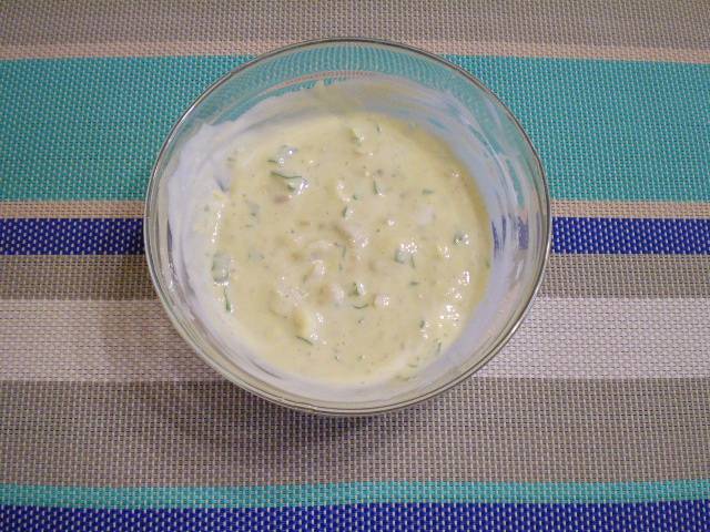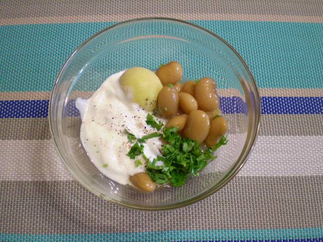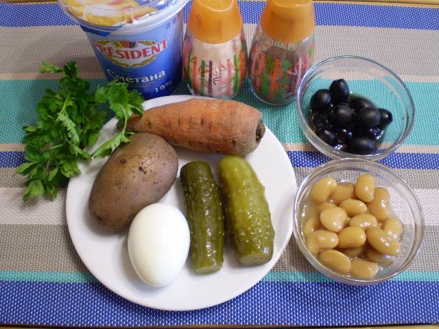 2. Яйцо делим на белок и желток. Из желтка, фасоли, зелени, специй и сметаны делаем соус для заправки салата. Все пюрируем блендером или вилочкой.
