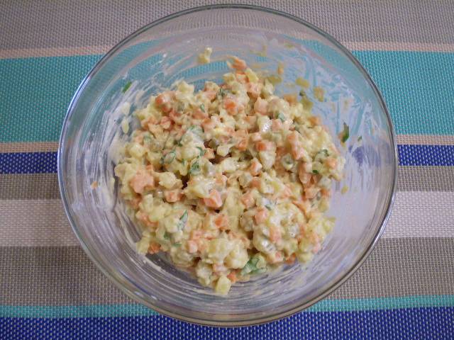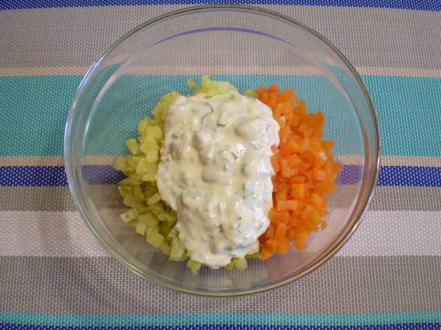 7. Сложите в салатник картофель, морковь, огурцы и заправьте салат соусом.