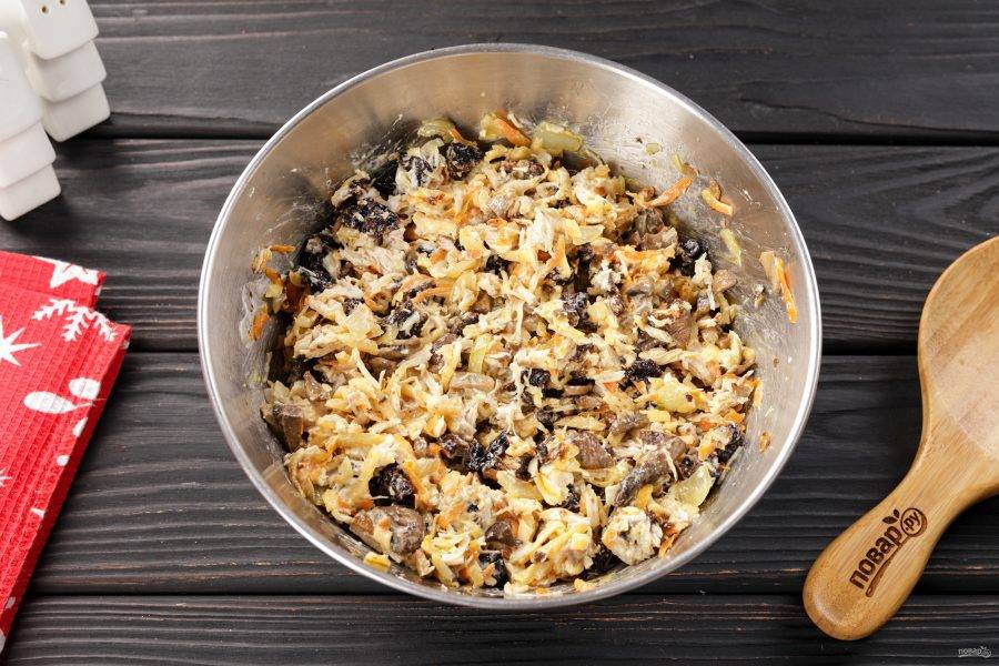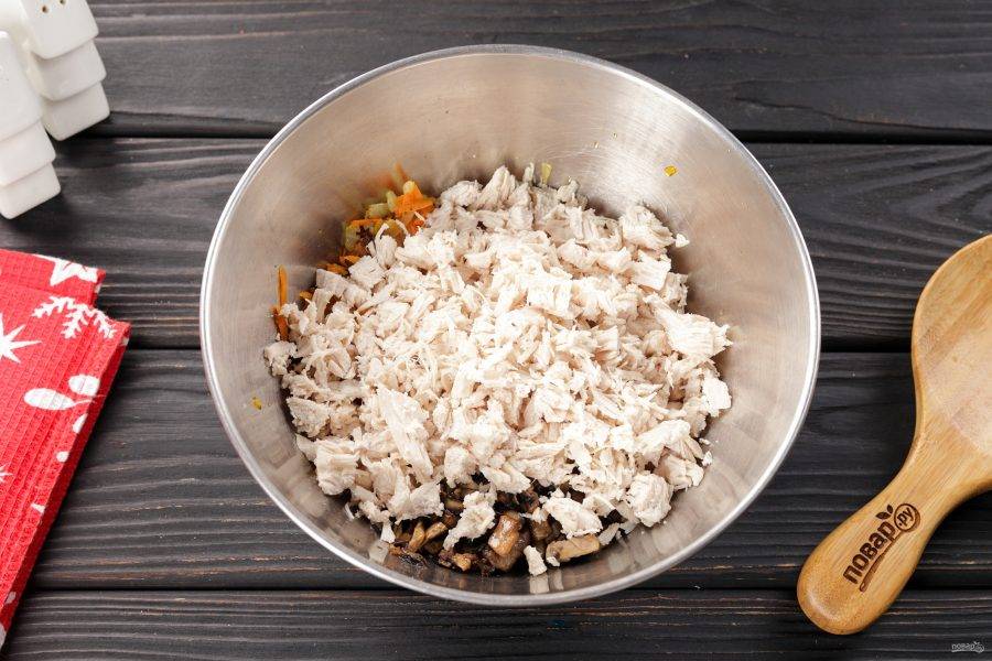 Лук с морковью и грибы переложите в глубокую миску. Добавьте нарезанную небольшими кусочками куриную грудку.