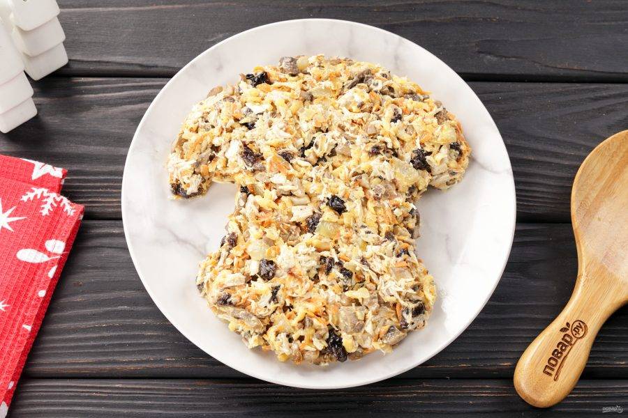 Выложите салат в форме головы Деда Мороза, как показано на фото.