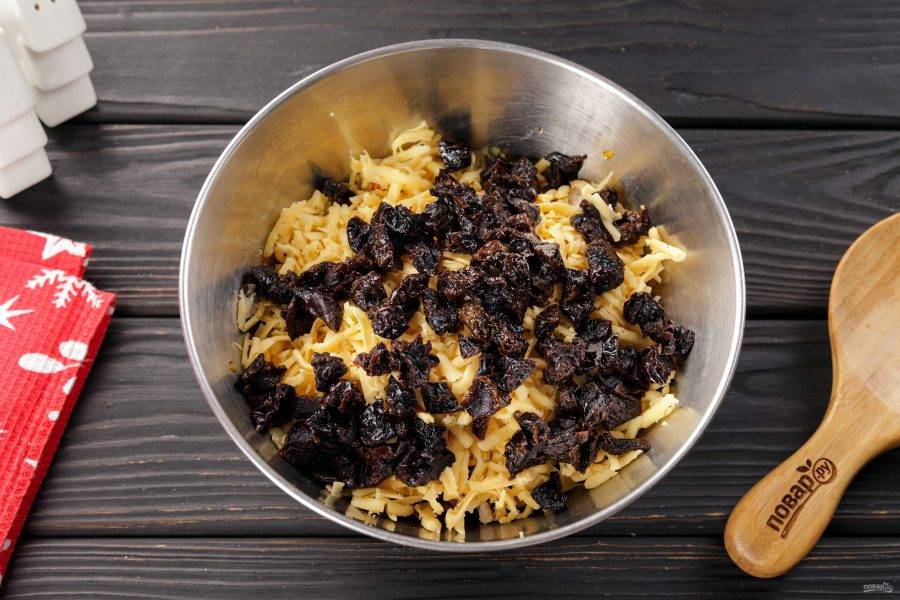 Чернослив нарежьте на 2-4 части. Предварительно чернослив залейте тёплой водой на несколько минут, а затем промойте.