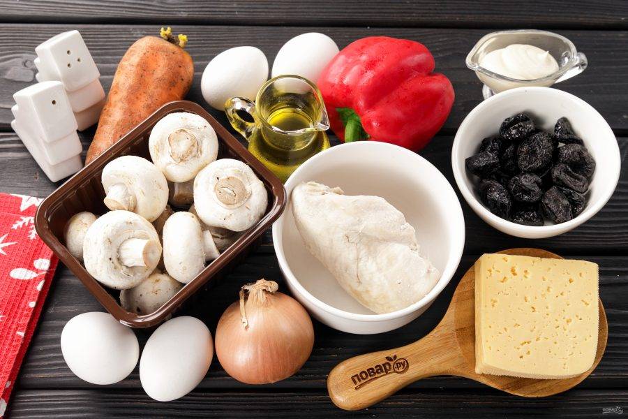 Подготовьте все ингредиенты по списку. Куриную грудку отварите заранее в подсоленной воде и оставьте остывать в бульоне. Яйца отварите и дайте так же остыть.