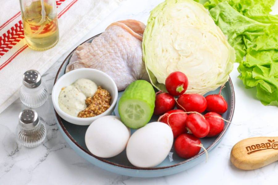 Подготовьте указанные ингредиенты. Огурец и редис промойте в воде, срежьте хвостики. С части капусты снимите верхние листья.