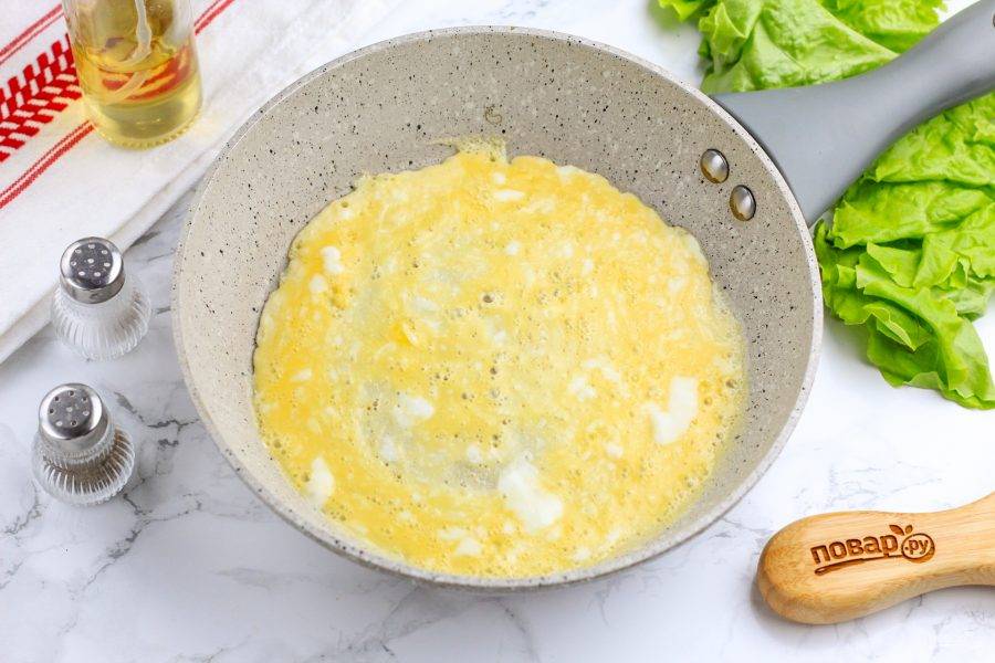 Смажьте сковороду растительным маслом, прогрейте ее на плите и влейте треть взбитой массы яиц. Обжарьте блин и выложите на тарелку. Таким же образом обжарьте еще 2 яичных блина. Остудите их в течение 3-5 минут.