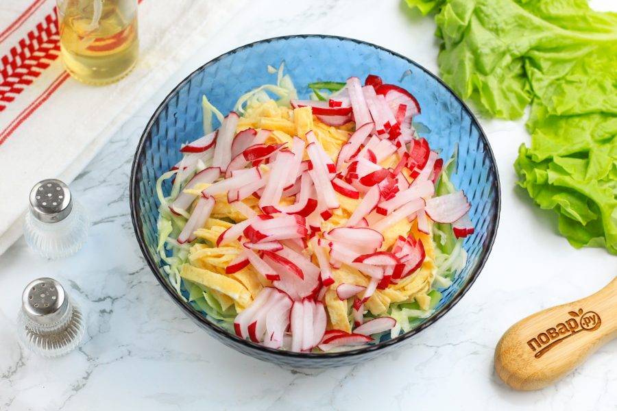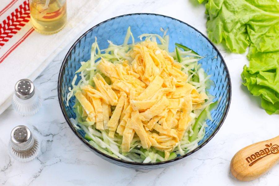 Таким же образом нарежьте яичные блинчики и добавьте их в емкость.
