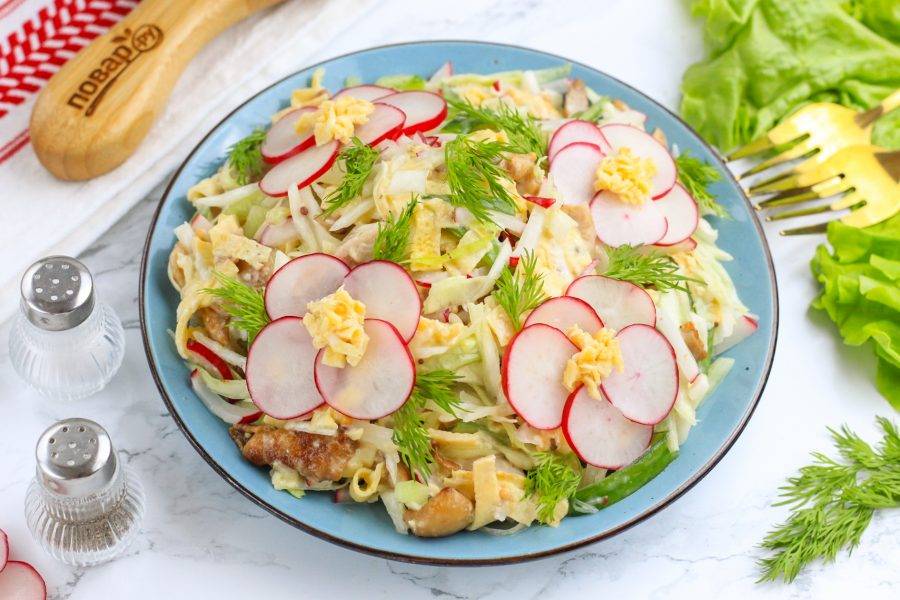 Нарежьте оставшийся редис кружочками. Выложите приготовленный салат на тарелку, из 5 кружочков редиса сформируйте ромашку и в ее серединку поместите измельченный ломтик яичного блинчика. Украсьте салат "Для любимой бабушки" свежей зеленью и подайте к столу. Приятного вам аппетита!